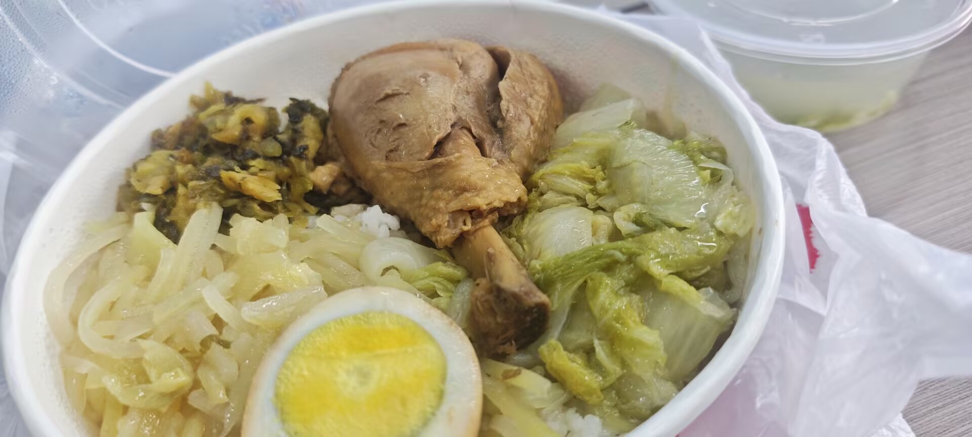 早上画重点完事儿了之后,我就开始思考中午吃啥。感觉早上画完重点了之后,感觉嘴巴有点干干的,很适合吃猪脚饭的样子。我感觉猪脚饭有一点很好的,就是他那个瘦肉切的碎碎的,很适合拌饭。只要再来一丢丢很合适的肥肉,那种肥瘦相间的感觉,咬下去真的很棒!对于我这种讨厌肥肉的人来说,肥肉的量一定要严格控制,不然的话就会太腻了!中午吃猪脚饭的时候,别的小菜我都不要,我把所有的小菜全都换成上海青了,我还顺便加了一点剁椒酱,拌了拌上海青。不得不说,这家猪脚饭的剁椒一点都不辣,主要是咸……上海青煮的刚刚好,不会没熟,也不会太软,咬下去嘎嘣脆的,而且带着青菜自带的清爽。它这个青菜感觉就是用开水炒了一遍,什么调料都没有,只有我拌的剁椒,感觉这样子青菜还挺不错的。如果加了点味道去炒的话,有油有盐的就没有这么清爽的感觉了。