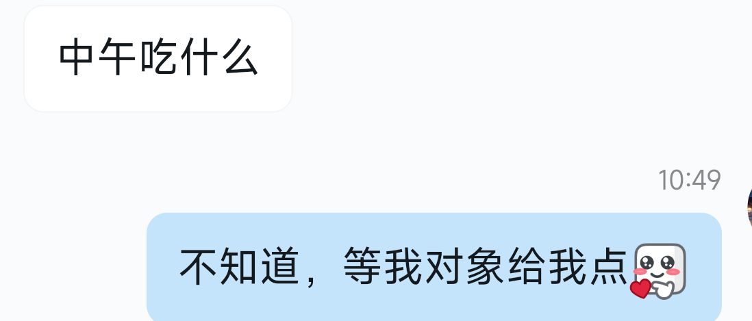 早上呢七点半醒了,敲门我表姐没开门,我就玩手机去了,八点了敲门还是没动静,就跑去买早餐了~因为八点了就跑快一点,八点十二买好回家,吃完给我表姐发消息“早餐在桌上”就跑咯~(以后跟你也会是这样的日子吗嘿嘿)